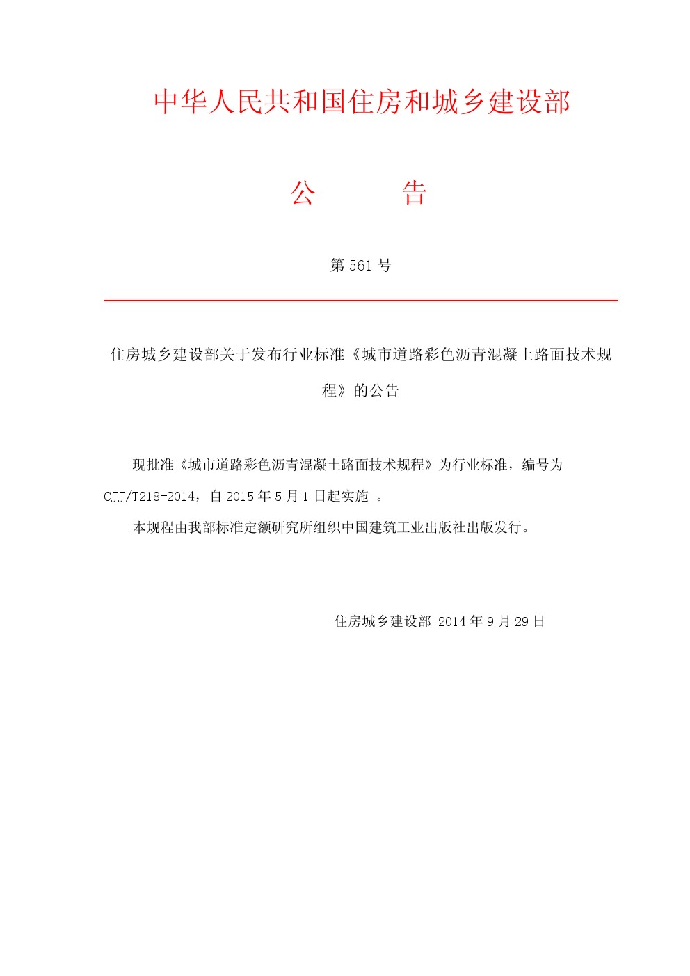 近日,由深(shen)圳(zhen)海川新材料科技有(you)限(xian)公(gong)司會同長安大學等有(you)關單位共同編制的住建部行業標準《城市道路(lu)彩(cai)色(se)瀝青混凝土路(lu)面技術規程》,由中華人民共和國住房和城鄉建設部2014年第561號文(中華人民共和國住房和城鄉建設部公告)正式發布,編號為CJJ/T218-2014,自2015年5月1日起實施。