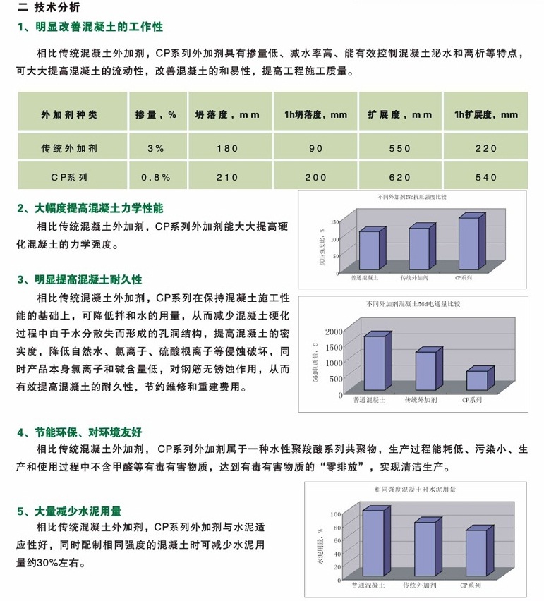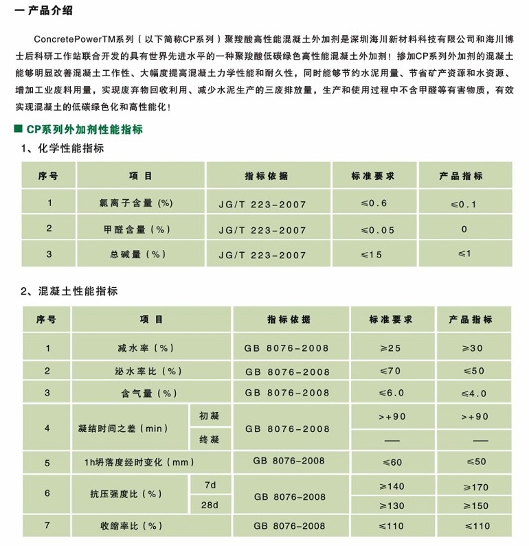 簡介:Concrete powerTM系列(以下簡稱CP系列(lie))聚羧酸高(gao)性能(neng)混(hun)凝土外(wai)加劑是深圳海(hai)川新(xin)材料(liao)科技(ji)有(you)限公司(si)和海(hai)川博士(shi)后科研工作(zuo)站聯合開發的具有(you)世界先進水平的一種聚羧酸低碳(tan)綠色高(gao)性能(neng)混(hun)凝土外(wai)加劑!摻加CP系列外加(jia)劑的混(hun)凝(ning)土能夠(gou)明(ming)顯改善混(hun)凝(ning)土工(gong)作性、大幅度提高混(hun)凝(ning)土力(li)學性能和耐久性,同時(shi)能夠(gou)節約水泥用(yong)量(liang)節省礦產(chan)資(zi)源、增加(jia)工(gong)業廢料用(yong)量(liang)、實現廢棄物回收利用(yong)、減(jian)少水泥生產(chan)的三廢排放量(liang),生產(chan)和使用(yong)過程中不含(han)甲醛等有害物質,有效(xiao)實現混(hun)凝(ning)土的低碳綠色化合高性能化!